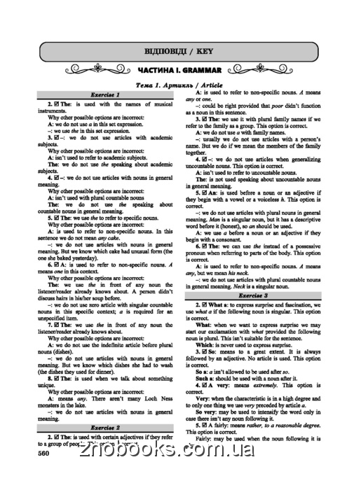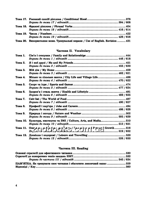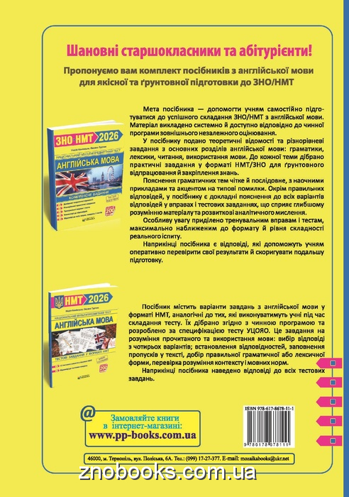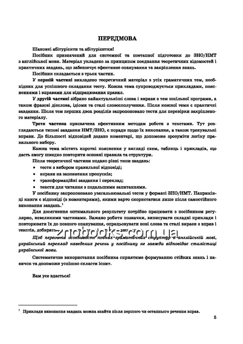 Мета посібника — допомогти учням у підготовці до успішного складання ЗНО/НМТ з англійської мови. Структурований і систематизований матеріал охоплює всі аспекти іспиту: граматику, лексику, використання мови, читання.