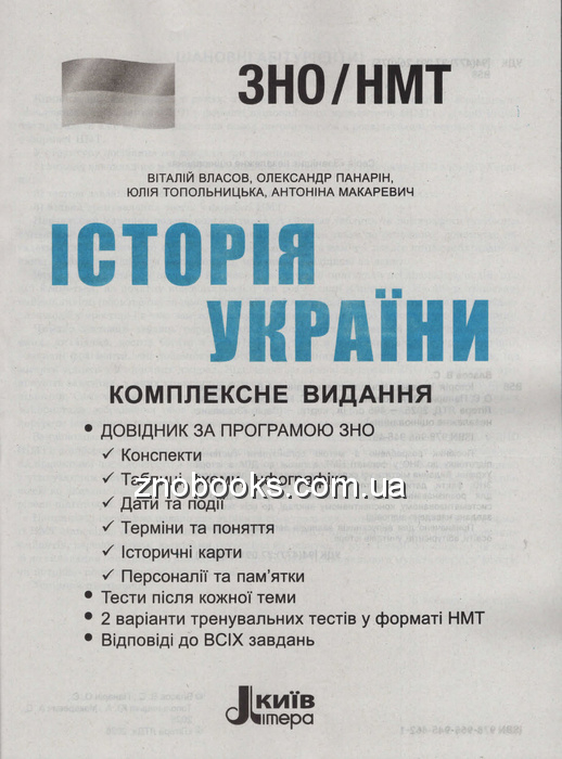 Посібник, автори Власов В., Панарін О., Топольницька Ю., Макаревич А., розроблено з метою організації системної підготовки до ЗНО у форматі НМТ, а також до ДПА з історії України. Видання містить усі складники, передбачені програмою ЗНО: факти, дати, поняття та терміни, персоналії, пам'ятки для розпізнавання тощо. Навчальний матеріал подано в систематизованому, конспективному вигляді, до всіх тестових завдань наведено відповіді.