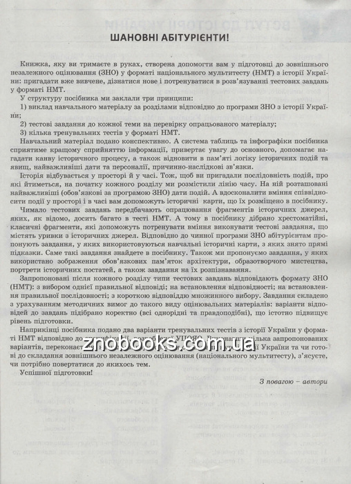 Книжка, яку ви тримаєте в руках, створена допомогти вам у підготовці до зовнішнього незалежного оцінювання (ЗНО) у форматі національного мультитесту (НМТ) з історії "України: пригадати вже вивчене, дізнатися нове і потренуватися в розв'язуванні тестових завдань у форматі НМТ.