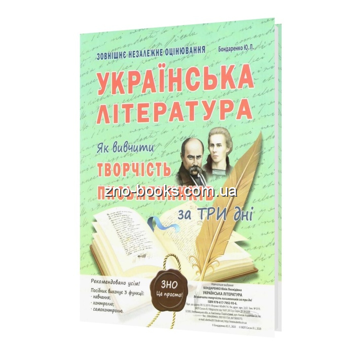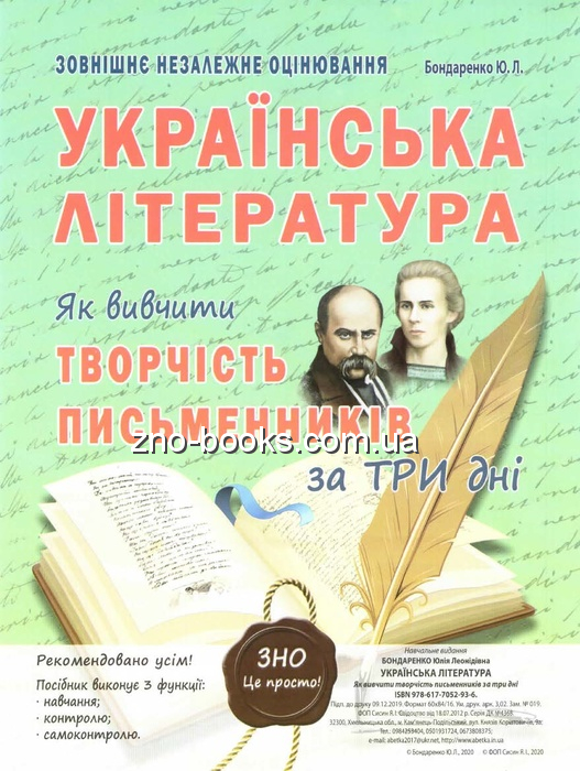 Систематизувати й запам'ятати усе необхідне з української літератури - найскладніше завдання підготовки до ЗНО. Цей посібник допоможе самостійно поновити й закріпити в пам'яті інформацію про прочитані художні твори, авторів цих творів та їхні характерні особливості . Скористайтеся цим тренінгом і переконайтеся, що засвоїти й упорядкувати матеріал, передбачений для вивчення Програмою ЗНО з української літератури, можна за три дні .